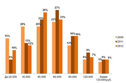 По данным Федеральной Службы Государственной Статистики (ФСГС) средний располагаемый (за вычетом налогов, сборов и обязательных платежей) доход семьи из трех человек летом 2012 года номинально составлял порядка 60-63 тыс.руб. в месяц. Таким образом, впервые за десять лет наблюдений желаемый уровень дохода (а именно так следует трактовать смысл ответа на предложенный вопрос) в среднем совпал с реальным. Еще в прошлом году желаемый уровень дохода превосходил реально располагаемый в среднем на 40% или в 1,4 раза. В 2009 году желаемый доход превосходил средний располагаемый ровно в 1,5 раза (56 и 37,5 тысяч рублей соответственно). В 2007 году разрыв в показателях превышал 60%, а в 2002 году был двукратным.