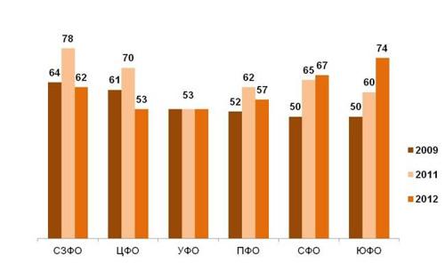 Если в 2009 году по федеральным округам картина в целом была достаточно ровная (см. диаграмму 2), то в 2011 году расслоение стало уже существенно более заметно. Конечно, и раньше из общего ряда выбивались ЦФО (за счет Москвы), СЗФО (за счет Санкт-Петербурга) и ДВО (в котором по общему мнению обывателей, социологов и экономистов и «цены выше, и жизнь доже»). В 2011 году разрыв между Северо-западом (78 тысяч) и Уралом (53 тысячи) стал неприлично большим.