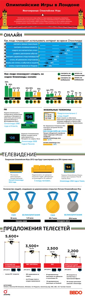 Предвидев то, что миллиарды цифровых экранов скоро изменят ситуацию на рынке, BBDO и Proximity приняли решение исследовать, как жители различных стран получают информацию об Олимпийских Играх при помощи различных цифровых устройств, и поделиться этим в своей инфографике.