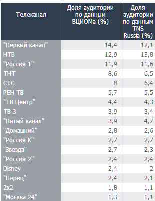 Данные, полученные ВЦИОМом, отличаются от результатов исследований основного действующего телеизмерителя — компании TNS Russia. Так, по данным ВЦИОМа, лидером среди московской аудитории за период с 1 по 24 февраля 2013 года был 'Первый канал' с долей 14,4%, опережая своего ближайшего конкурента НТВ на 1,5 процентных пункта. По данным TNS, напротив, лидирует НТВ с долей в 13,8% против 12,1% у 'Первого канала'. Заметно отличаются и доли таких каналов, как ТНТ (8,6%, по данным ВЦИОМа, против 6,5% по TNS) и СТС (8%, по данным ВЦИОМа, против 6,4% по TNS). Результаты телеканалов, принадлежащих московскому правительству, напротив, близки у обоих измерителей: доля 'ТВ Центра' составляла 4,4% по ВЦИОМу и 4,3% по TNS, доля 'Москвы 24' — 1,3% по ВЦИОМу и 1,1% по TNS. Гендиректор TNS Russia Руслан Тагиев не стал комментировать результаты медиаизмерений ВЦИОМа.