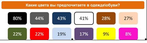 Достаточно предсказуемым оказался рейтинг предпочитаемых в одежде цветов. На первом месте – черный цвет с 80% голосов. Затем более чем 40% россиян назвали такие нейтральные и универсальные цвета: серый, синий и белый. Опрос показал что бежевый, красный, голубой и розовый привлекают куда больше представительниц прекрасного пола.