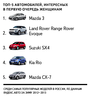 По данным сервиса Яндекс.Авто, российские женщины мало интересуются автомобилями отечественных марок. В первую очередь у прекрасного пола популярны следующие модели: