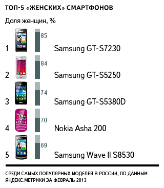 Для сравнения, самые «мужские» смартфоны (среди пользователей которых женщин меньше 25%) — это устройства на платформе Pocket PC, флагманский смартфон Nokia — Lumia 920 и смартфон с поддержкой двух сим-карт Fly IQ440.
