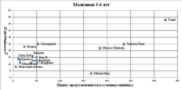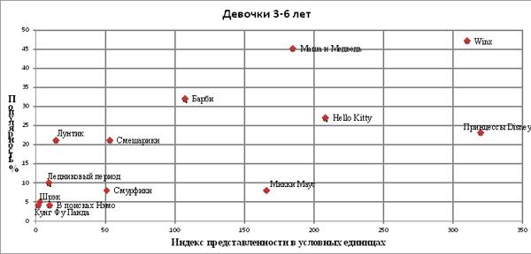 По результатам второй волны исследования «Новое поколение» компанией Synovate Comcon был составлен список наиболее покупаемых брендов. Родителям детей 4-15 лет во всех городах-миллионниках предложили ответить на вопрос: «Товары с какими персонажами Вы покупали для своего ребенка за последние шесть месяцев 2012 года?» Полученная исследователями информация выражена в процентах и сгруппирована по возрастным сегментам в группах девочки и мальчики. В нашем графике покупательские предпочтения вынесены на ось Y.