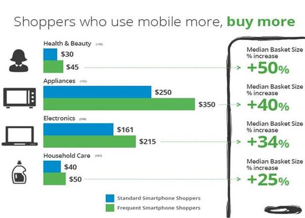 С одной стороны, покупатели используют свои смартфоны в магазинах для того, чтобы сэкономить. С другой стороны, парадокс: те, кто часто пользуется мобильными устройствами во время шопинга, тратят больше остальных. Для некоторых категорий разница может достигать 40-50%: «Электроника» (на 34% больше), «Бытовая техника» (на 40% больше), «Здоровье и красота» (на 50% больше).