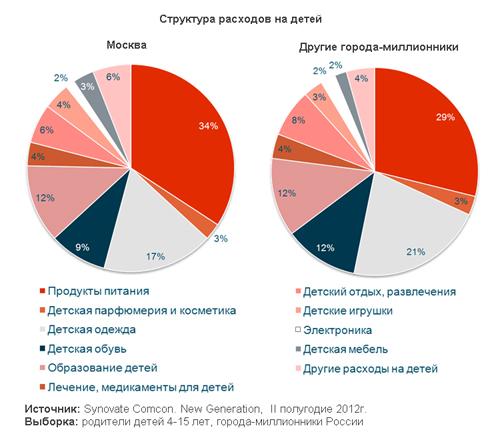 В 2012 году росли траты на питание, которые занимают около трети в общей структуре расходов на детей. Еще около 30% родители тратят на детскую одежду и обувь. 12% трат уходит на расходы, связанные с образованием детей. 7% составляют траты на детский отдых, развлечения. Сезонно во втором полугодии растут расходы на детскую одежду, обувь, школьные принадлежности и траты на отдых детей.