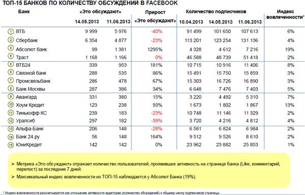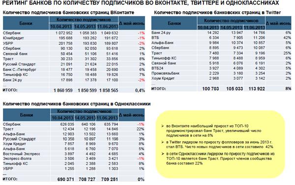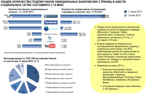 Из новостей июня Frank Research Group отмечает появление в Facebook банков «Интеза» и «Русфинанс». Также в исследовании отмечается «большое пополнение списка аккаунтов «ВКонтакте»: введены в мониторинг страницы Москомприватбанка, Росбанка, банка «ЖилФинанс», Бинбанка и Русфинанс Банка».