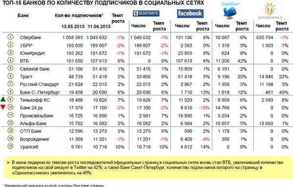 Лидером в июне по темпам прироста числа подписчиков вновь стал ВТБ (плюс 42% в Twitter), а также банк «Санкт-Петербург» (плюс 49% в «Одноклассниках»).