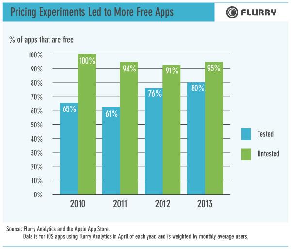 По информации Flurry, все большую долю составляют бесплатные приложения. Если в прошлом году на них приходилось 84% анализируемого рынка, то в текущем доля их составила уже 90%. Соответственно, доля платных приложений, цена которых составляет до 99 центов, уменьшается. В минувшем году она составила 10% от общего числа всех используемых приложений.
