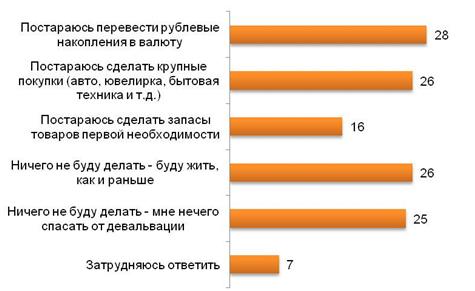 Почти две трети россиян с различной долей уверенности полагают, что в ближайшее время может произойти девальвация рубля, о которой так много говорят. Противоположного мнения придерживается каждый пятый опрошенный. При этом 51% респондентов в случае девальвации ничего в связи с этим предпринимать не собираются. Половина из них ссылается на то, что у них попросту нет сбережений, которые стоит спасать. Другая же половина уверена, что падение курса рубля никак не скажется на их финансовом состоянии, поэтому они будут продолжать жить, как и раньше. Однако четверо из десяти опрошенных, вероятно, помня уроки кризиса 1998 года, заявили, что при первых признаках обвала рубля постараются либо обратить накопления в национальной валюте в доллары или евро, либо потратить. Уже сейчас более половины россиян уверены, что в случае девальвации им придется оптимизировать свои расходы, отказаться от части развлечений и поездок. Каждой пятой семье придется отказаться даже от некоторых товаров и продуктов.