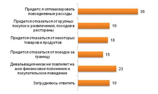 Более трети опрошенных совершенно точно уверены, что возможная девальвация потребует от них оптимизации повседневных расходов. От крупных покупок и развлечений придется отказаться каждой пятой семье (19%). И еще 18% респондентов полагают, что им придется отказаться даже от некоторых товаров и продуктов. 15% опрошенных готовы временно распрощаться с поездками за границу.
