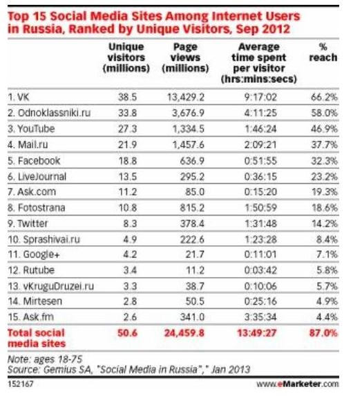 В России, как и в Китае, лидируют национальные соцсети, причем Facebook занимает всего лишь пятое место после VK, Odnoklassniki.ru, YouTube и Mail.ru с 18,8 млн уникальных посетителей в сентябре 2012 года (по данным Gemius SA). Несмотря на не слишком впечатляющие цифры Facebook в Рунете неплохо растет: на 62% в 2012 и (предположительно) на 57,8% в 2013. К 2017 число его пользователей должно удвоится.