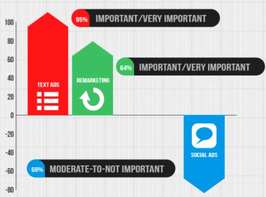 Текстовые объявления (95%) и Ремаркетинг (64%) продолжают оставаться приоритетными и важными рекламными направлениями для маркетологов. PPC объявления в социальных сетях до сих пор оцениваются как реклама «умеренной важности»: