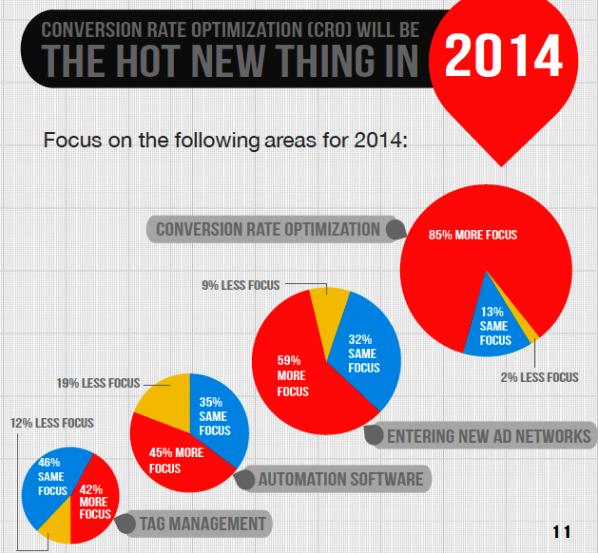 85% маркетологов сказали, что в 2014 году планируют уделить оптимизации конверсии больше внимания, чем любой другой области. 59% планируют увеличить внимание на новые рекламные сети, 45% на программное обеспечение автоматизации и 42% на тег-менеджмент.