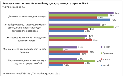 Россиянкам 18-55 лет в большей степени, чем представительницам других стран БРИК, свойственно стремление молодо выглядеть (74%) Для бразильянок главной мотивацией, связанной с внешностью, является желание выглядеть привлекательно для противоположного пола (74%). При опросе, проведенном в 2012 г., 37% бразильянок отметили, что придают большое значение красоте своего тела и готовы рассмотреть возможность пластической операции. В России женщины также следят за своей фигурой – треть представительниц прекрасной половины отметили, что все время стремятся сбросить вес. При этом количество женщин, использующих средства для коррекции фигуры, увеличилось с 2000 г. в 3 раза (4% – в 2000 г., 12% – в 2012 г.).