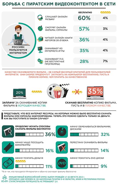 Всероссийский центр изучения общественного мнения представила данные о том, какой контент российские пользователи интернета скачивают наиболее охотно, сколько стараются делать это бесплатно и что предпримут, если все фильмы и сериалы в Сети станут платными