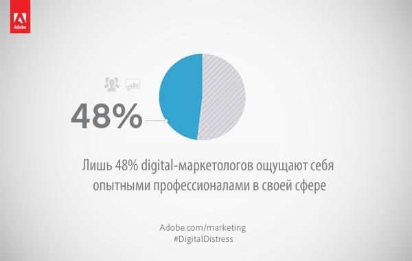 Подробный опрос маркетологов показал, что им не хватает уверенности в том, что они хорошо справляются с современными цифровыми технологиями. Меньше половины (48%) из тех, кто считает себя digital-маркетологами, ощущают себя опытными профессионалами в своей сфере. Кроме того, большинство digital-маркетологов не проходили никаких тренингов, связанных с digital-маркетингом: 82% сообщили, что всему учились прямо в ходе работы.