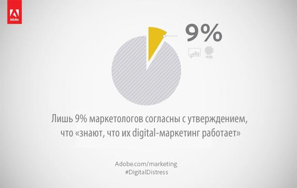 Также маркетологи не испытывают особого доверия к тому, как работают маркетинговые программы их фирм. Только 40% полагают, что их маркетинг эффективен. Что касается оценки именно digital-кампаний, то лишь 9% опрошенных согласны с утверждением, что «знают, что их digital-маркетинг работает». Тем не менее необходимость в вычислении эффективности маркетингового воздействия растет: 68% респондентов сообщили, что необходимость подтвердить возврат инвестиций давит на них все сильнее.