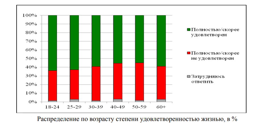 При общей неудовлетворенности жизнью в России (39% респондентов) молодежьпродемонстрировала более высокий уровень социального оптимизма. Наиболееудовлетворенные в этом плане — люди 18–24 и 25–29 лет. Наибольший пессимизмнаблюдается среди респондентов 40–59 лет.
