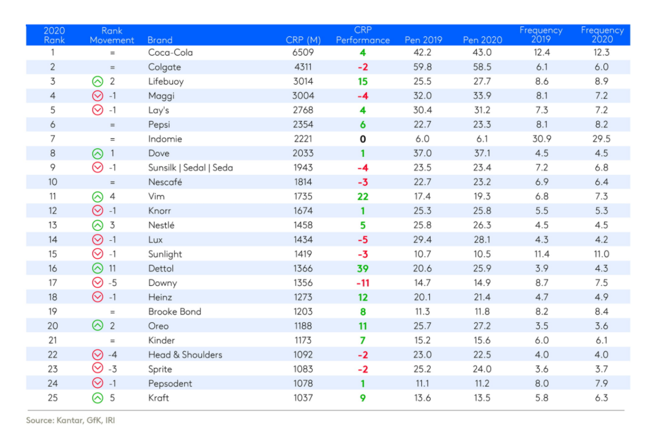 Kantar представила глобальныйрейтинг Brand Footprint 2021, куда вошли самые сильные ипопулярные у потребителей FMCG-бренды. В первую тройку попали Coca-Cola,Colgate и Lifebuoy (линейка средств для личной гигиены, принадлежит Unilever).За ними следуют Maggi, Lay’s, Pepsi, Indomie (лапша быстрого приготовления),Dove, Sunsilk/Sedal/Seda и Nescafe.