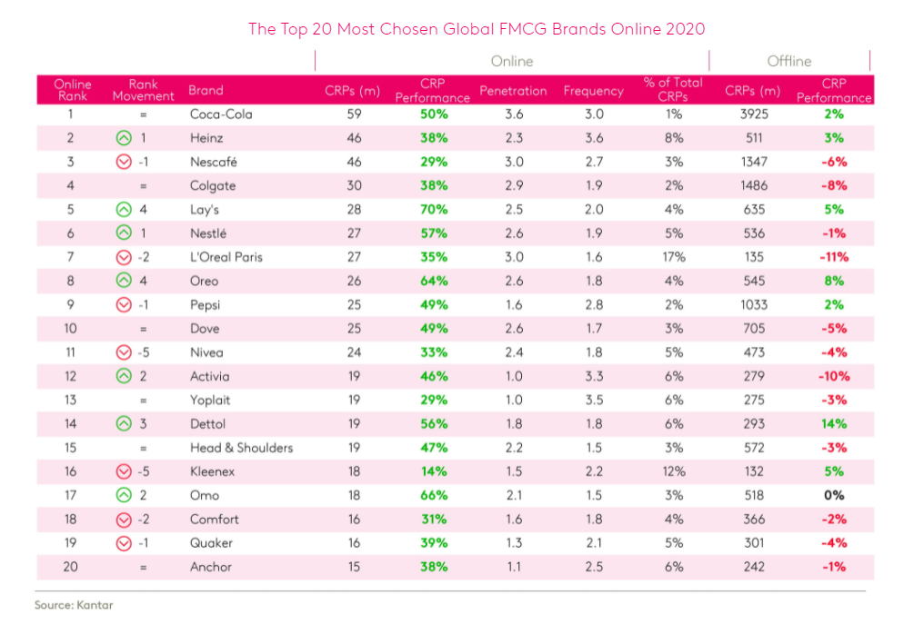 Глобальный онлайн-рейтинг также возглавила Coca-Cola. Далее идут Heinz,Nescafe, Colgate, Lay’s, Nestle, L’Oreal Paris, Oreo, Pepsi, Dove.