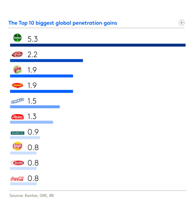 Лидером по завоеванию новых потребителей (penetration) стал Dettol, что вусловиях новой коронавирусной инфекции весьма логично. Однако продовольственныхбрендов все же больше, чем непродовольственных, — шесть против десяти: Maggi,Oreo, Heinz, Lay’s, Barilla и Coca-Cola.