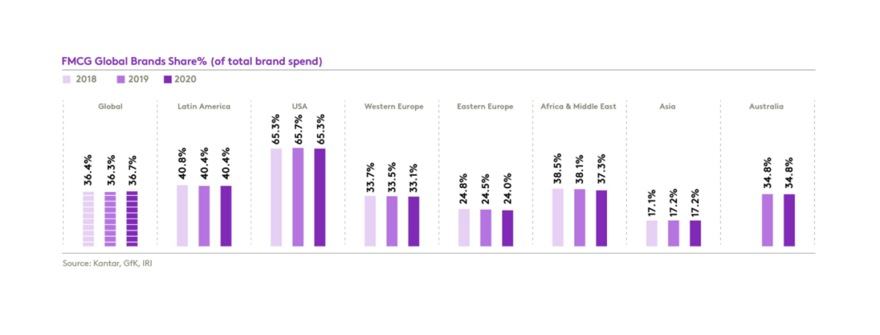 В Kantar также оценили соотношение между глобальными и локальными брендами вразличных регионах. В общемировом масштабе на глобалов приходится более36%, последние три года этот показатель практически не меняется. Самая заметнаядоля — в США (65%), наименьшая — в Азии (17%) и Восточной Европе (24%).Например, в Китае первую десятку «оккупировали» местные бренды, а глобальныйпоявляется только на 13-м месте (и это Lay’s). Наибольший вклад в прирост CRP в2020 г. внесли Индия (31%) и США (24%).