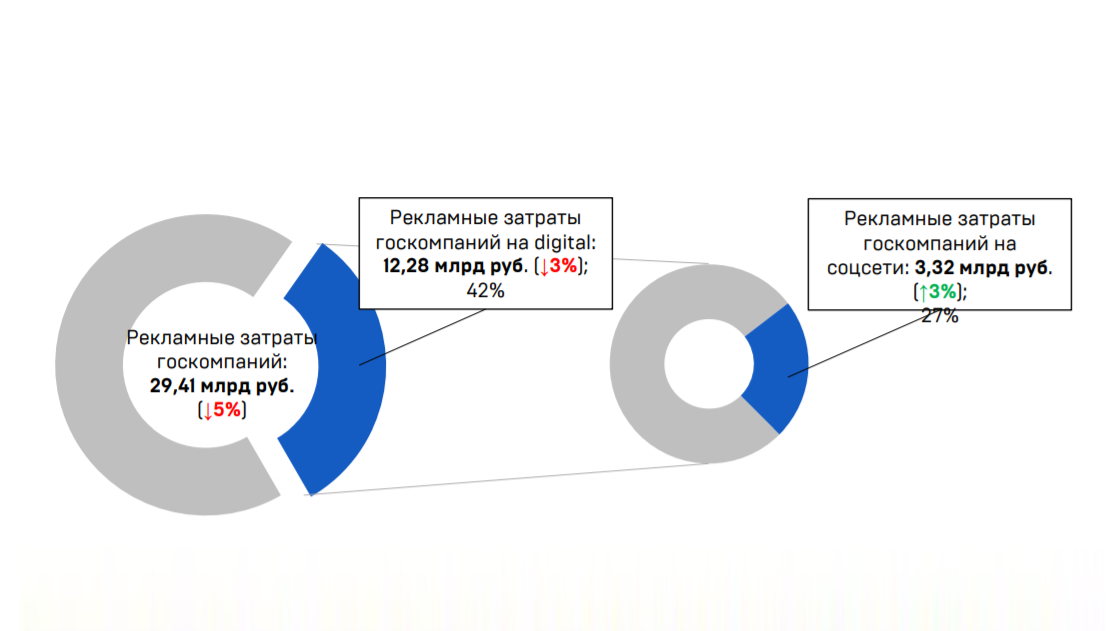 В целом госсектор потратил на рекламу 33,37 млрд руб., что на 2% меньшеотносительно предыдущего года. Затраты на интернет-рекламу составили почти 14млрд руб., то есть на долю digital пришлось 42% маркетинговых бюджетов.