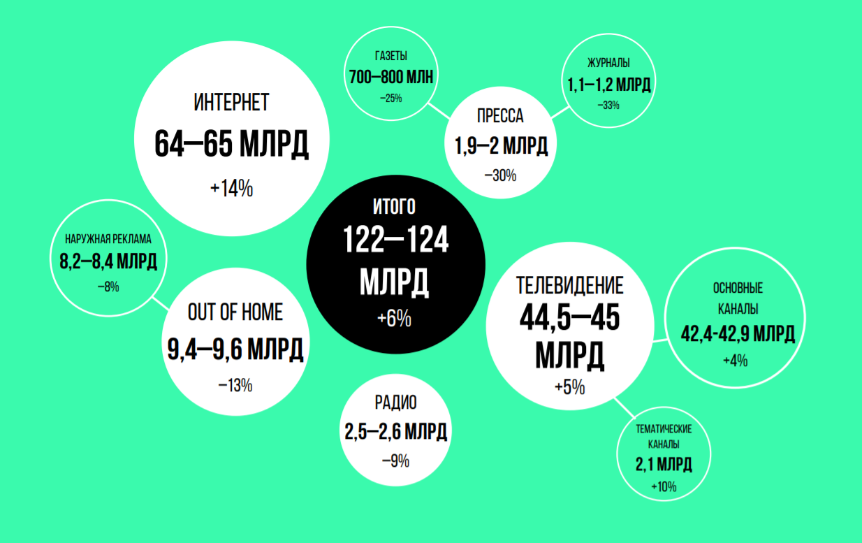 Суммарный объем рекламных бюджетов в средствах распространения составил 123млрд руб. Таким образом, рекламный рынок показал рост на 6%, несколькоускорившись по сравнению с предыдущим кварталом, когда ростсоставил4%.