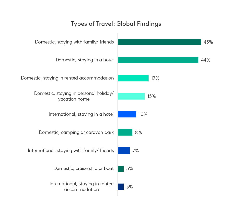 Вполне естественно, что COVID-19 ограничил передвижения людей границами ихродных стран. Самыми распространенными вариантами были внутренние поездки сразмещением у родных/друзей (45%) либо в отелях (44%). Только 10% путешествийпришлось на международные поездки с бронированием гостиницы.