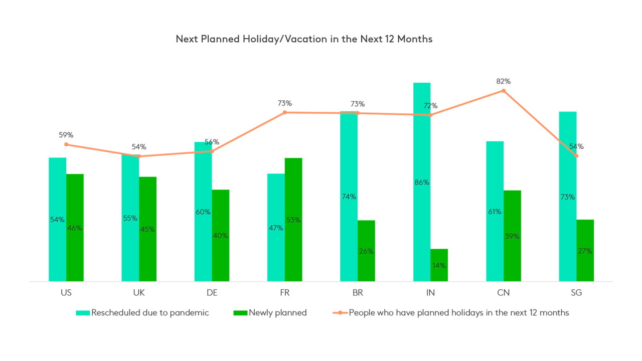 Не до отдыха было жителям Сингапура — 80% местных респондентов сообщили, чтони разу не путешествовали за последние 12 месяцев, и всего 12% сингапурцевсовершили хотя бы одно путешествие. Без путешествий прожили ковидный год многиереспонденты из Великобритании (68%), Германии (61%) и США (56%).