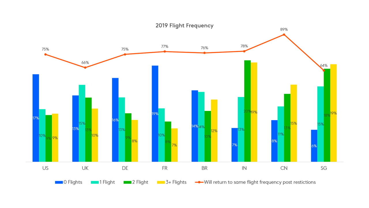 Kantar также выяснила, как часто летали респонденты до пандемии. Более трехперелетов совершали жители Индии, Сингапура (по 19%) и Китая (15%). Почти 90%китайцев уверены, что вернутся к прежним показателям после стабилизацииситуации.