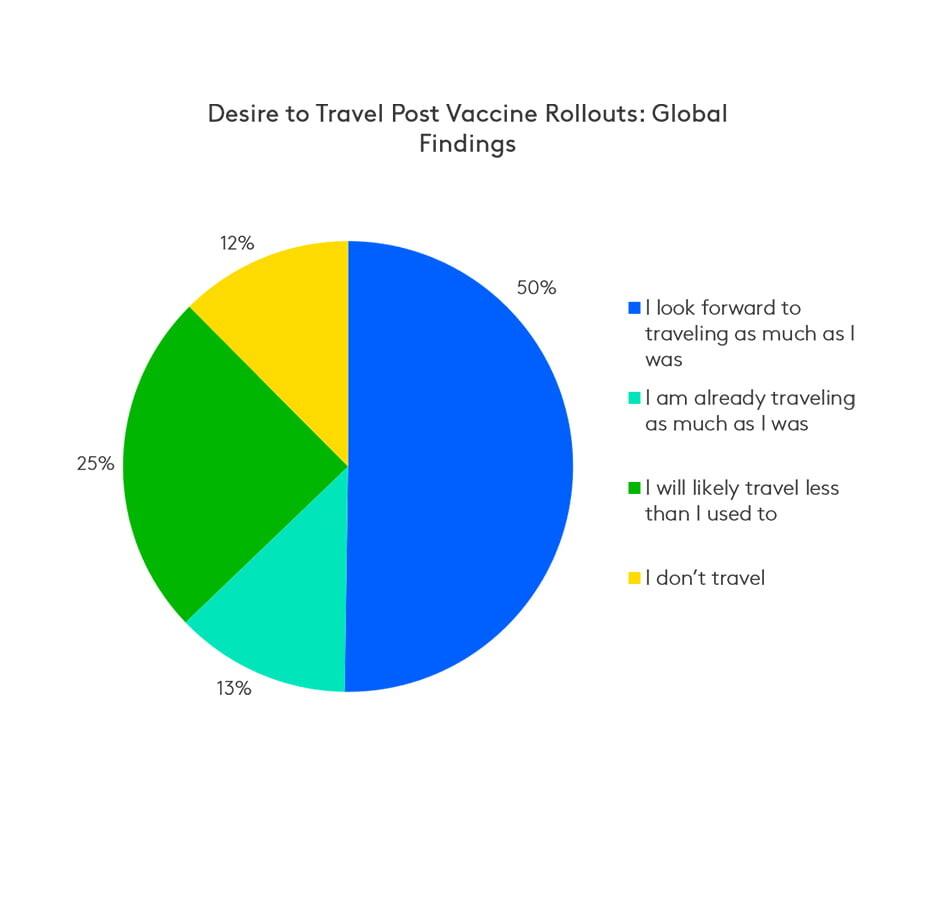 По завершении вакцинации в своей стране половина опрошенных намеренапутешествовать так же часто, как раньше, а четверть планирует умеритьактивность.