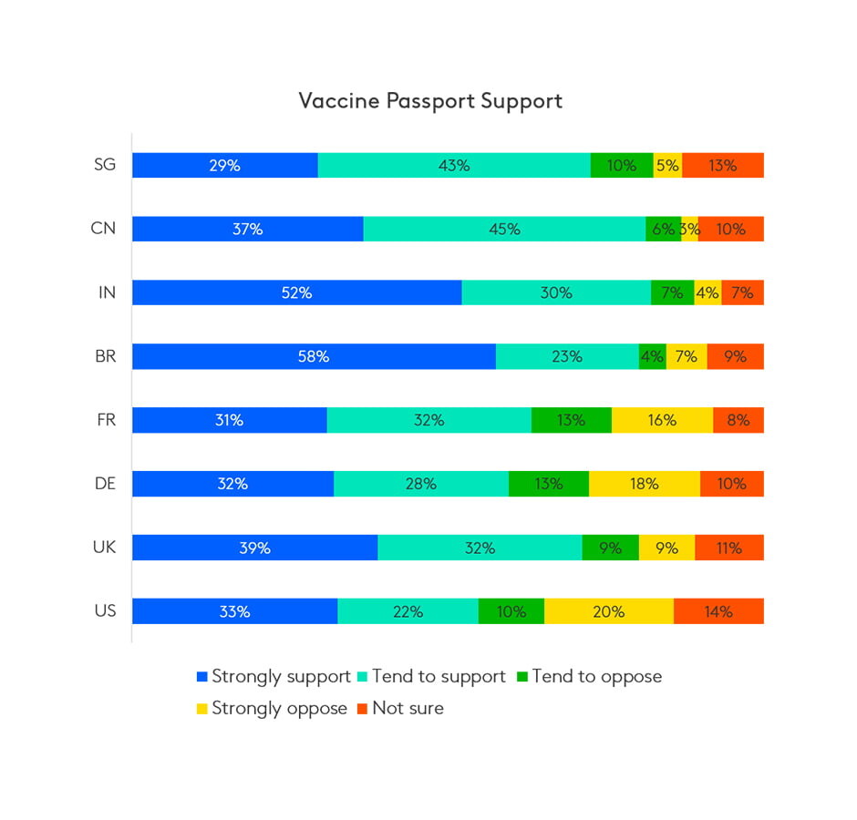 Идею паспорта вакцинированного поддерживают 70% пользователей, особенно вБразилии (81%). Больше всего противников в Германии (31%) и США (30%).
