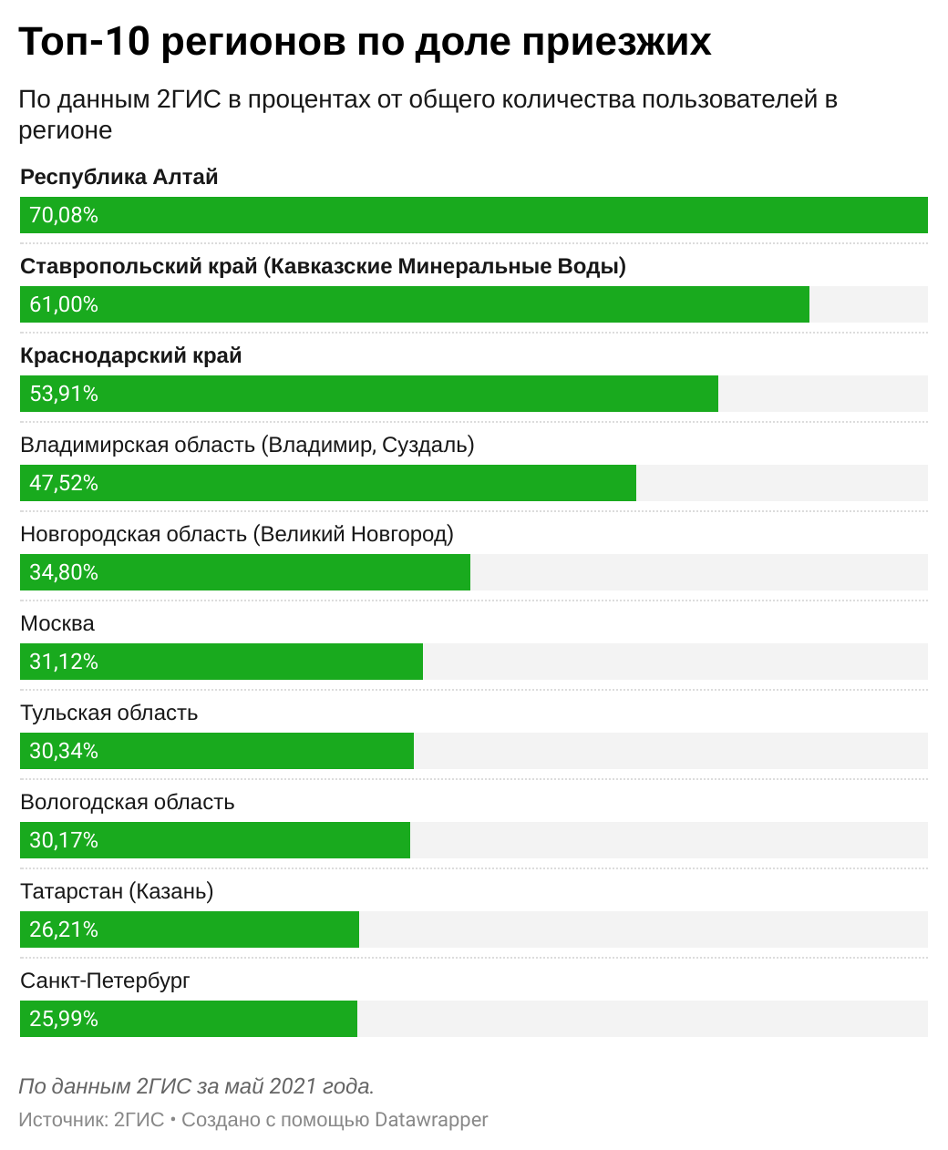 «Доля туристов от общего количества активных пользователей геосервиса “2ГИС”в Республике Алтай составила 70%, в Ставропольском крае – 61%, в Краснодарскомкрае – 54%», — рассказал руководитель PR-службы «2ГИС» Максим Бугаев.