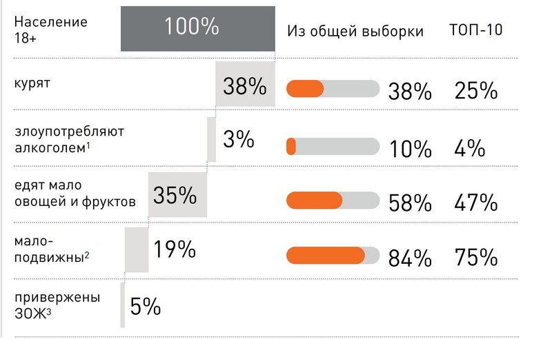 Смертность населения до 65 лет от болезней и последствий нездорового образажизни в городах РФ значительно выше, чем в городах ОЭСР. И сами жителиоценивают свое состояние здоровья хуже. При этом лишь 5% взрослого населениягородов РФ серьезно следуют принципам здорового образа жизни.