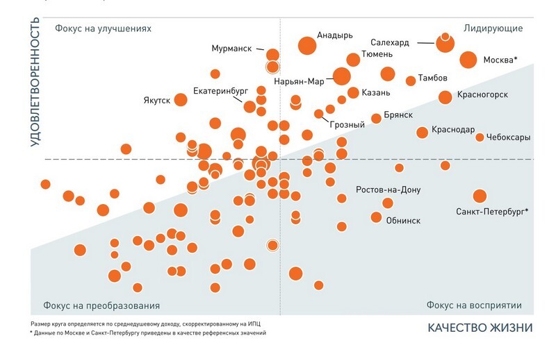 Для субъективной оценки удовлетворенности своей жизнью в качествереференсных значений взяты данные по Москве и Санкт-Петербургу. Исследованиепоказало, что во многих городах с высоким образом жизни высока инеудовлетворенность населения.