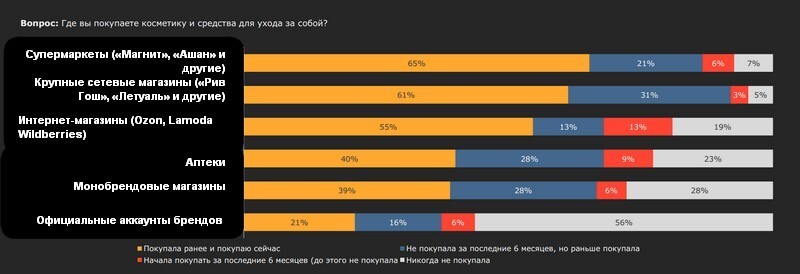 Российские женщины стали чаще покупать косметику в онлайн-магазинах, предпочитая сначала посмотреть видеообзор в Instagram кого-либо из известных блогеров. При этом им важно, чтобы бренд вел свою страничку в соцсетях с подробным описанием товара, иллюстрированным фотографиями