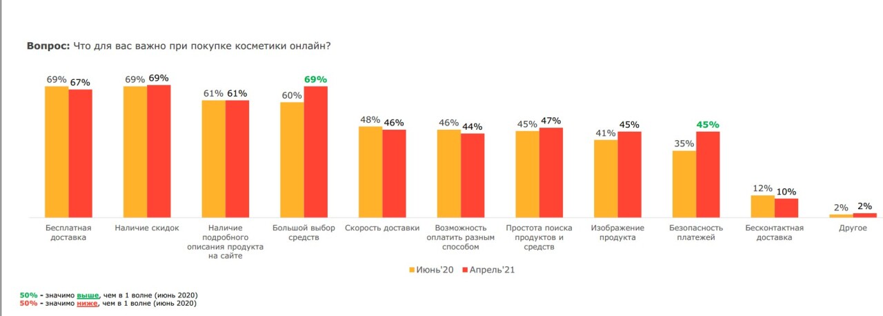 Как и годом ранее, при покупке косметики онлайн для женщин важны: бесплатнаядоставка, наличие скидок, подробное описание товаров и широкий ассортимент. Приэтом в 2021 году женщины стали больше обращать внимание на широкий ассортимент(69% в 20201 г. в сравнении с 60% в 2020 г.) и на безопасность платежей прионлайн-покупке (45% в сравнении с 35%).