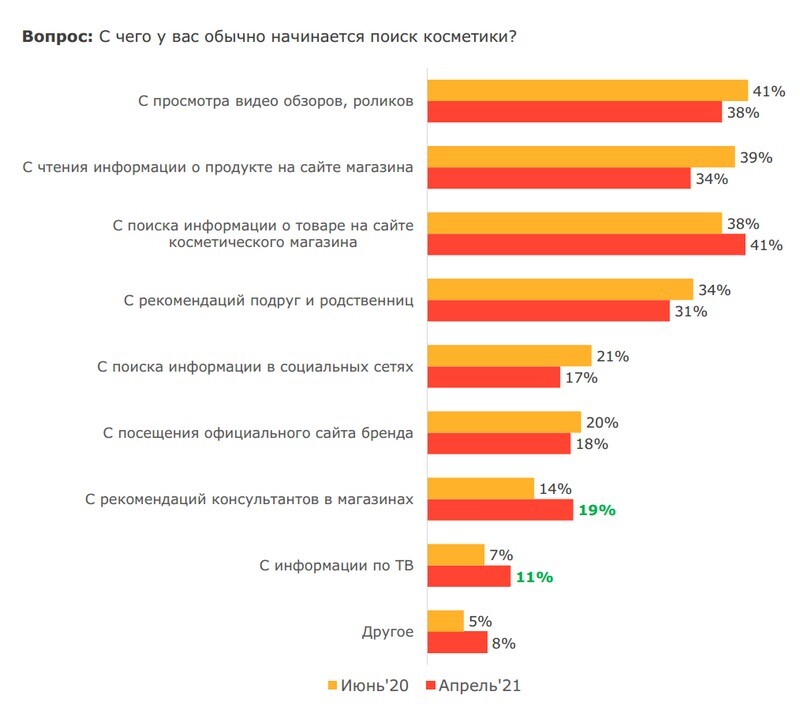 По-прежнему ценится информация о ценах, скидках и акциях, а также отзывыреальных людей. В 2021 г. вырос запрос на розыгрыши косметики (34% в 2020 г. всравнении с 25% в 2020 г.) и игры для подписчиков (11% в сравнении с 7%).