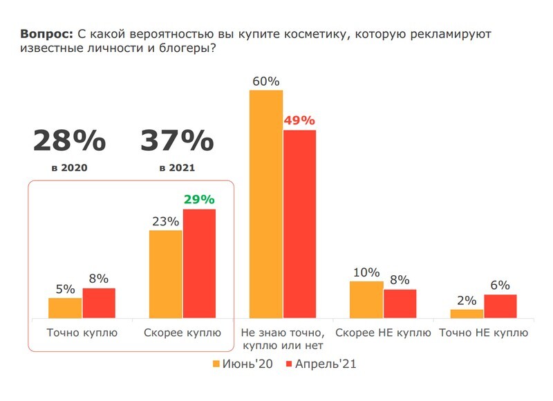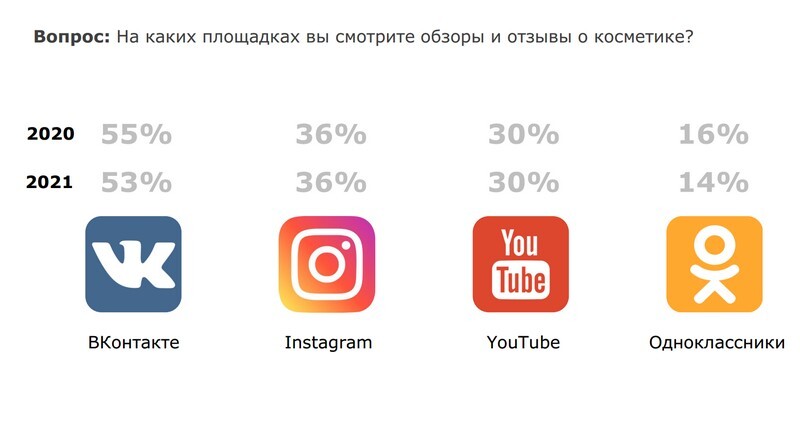 Агентство Migel Agency представило исследование влияния соцсетей на покупкукосметики. Опросы проводились в две волны: первая — май — июнь 2020 г., вторая— апрель 2021 г. Опрашивались жительницы российских городов в возрасте от 18до 40 лет.