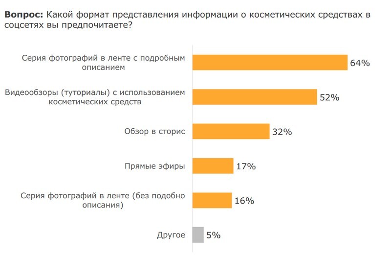 Информацию потенциальные покупательницы косметики предпочитают получать ввиде серии фотографий в ленте с подробным продукта (64%) либо в форматевидеообзора/туториала (52%).