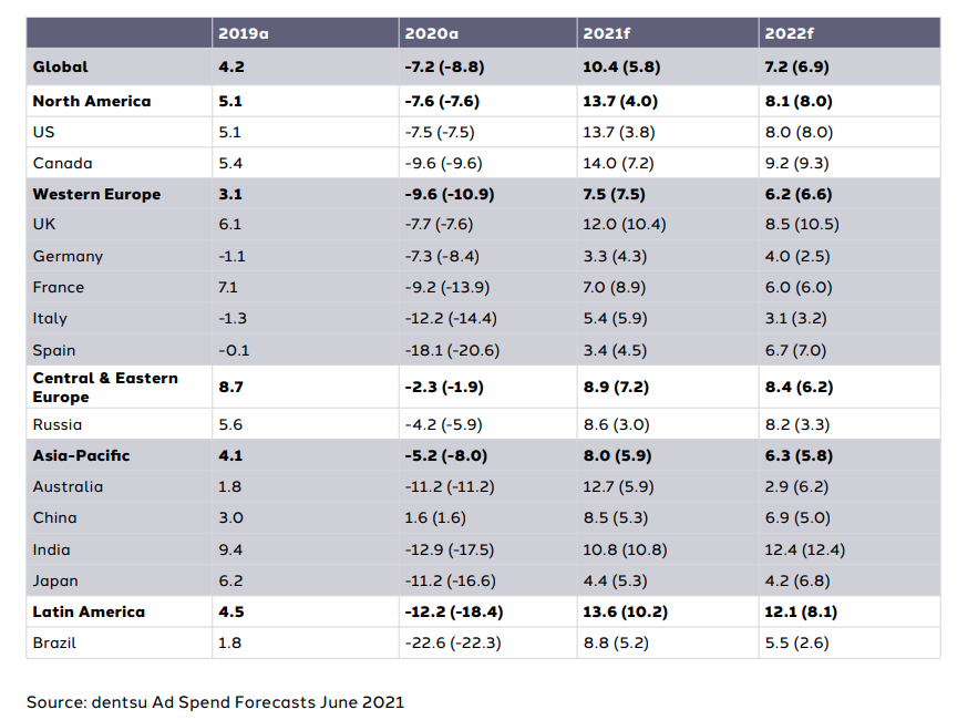 Ожидается, что глобальные рекламные затраты по итогам 2021 г. увеличатся на10,4%, или до $634 млрд — это на 4,6 п. п. больше предыдущего прогноза.Наиболее высокие темпы роста покажут рынки Канады (+14%), США (+13,7%),Австралии (+12,7%), Великобритании (+12%) и Индии (+10,8%). На пяти рынках(Великобритания, Канада, Китай, Россия и США) объем медиаинвестиций превыситдокризисные показатели.