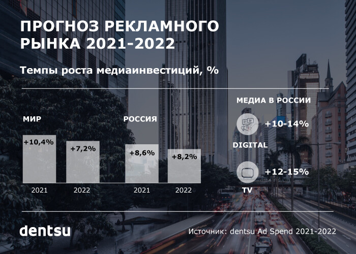 Что касается российского рекламного рынка, то он в 2021 г. увеличится на8,6%, в 2022 году — на 8,2%, прогнозирует dentsu. Ранее холдинг рассматривалдва варианта развития событий: +10% в случае позитивного развития национальнойэкономики и отсутствия шоковых факторов и +3% при неблагоприятноймакроэкономической ситуации.
