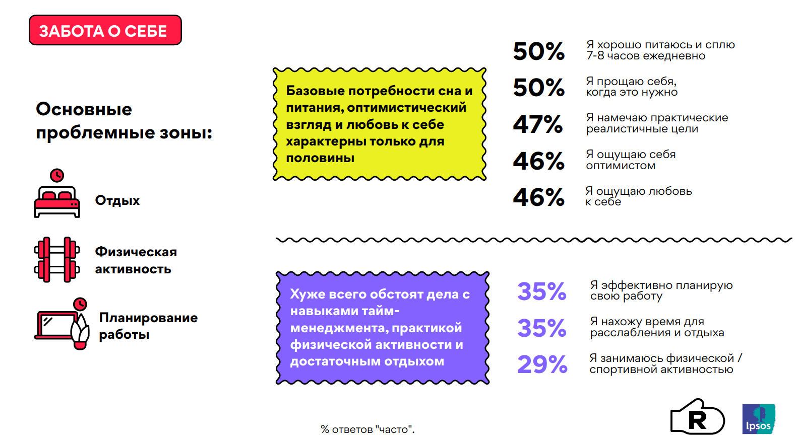 Реклама — индустрия для трудоголиков: 64% берут работу на дом иработают больше 8 часов в день, причем культура трудоголизма зачастуюпоощряется топ-менеджментом. Всего 35% спят не меньше 7 часов в день ирегулярно находят время для отдыха, а с физической активностью все в порядкетолько у 29%.