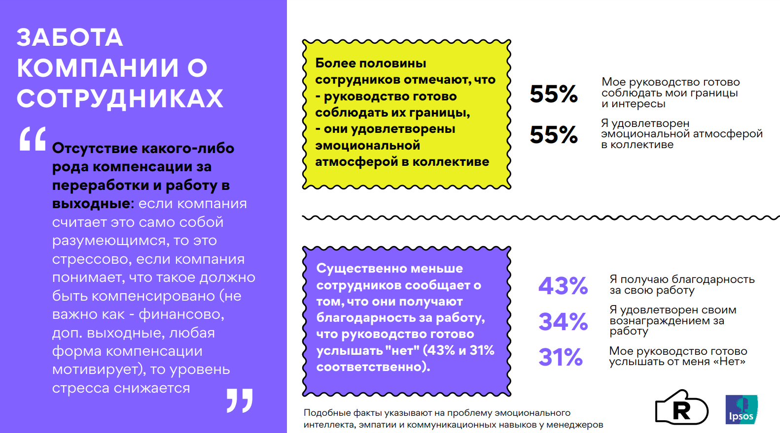 Такая самоотдача не всегда оправданна: в среднем всего один из трехспециалистов удовлетворен вознаграждением за работу. И только 31% сотрудниковсчитают, что их руководитель соблюдает личные границы и готов услышать «нет» насвязанные с работой просьбы.