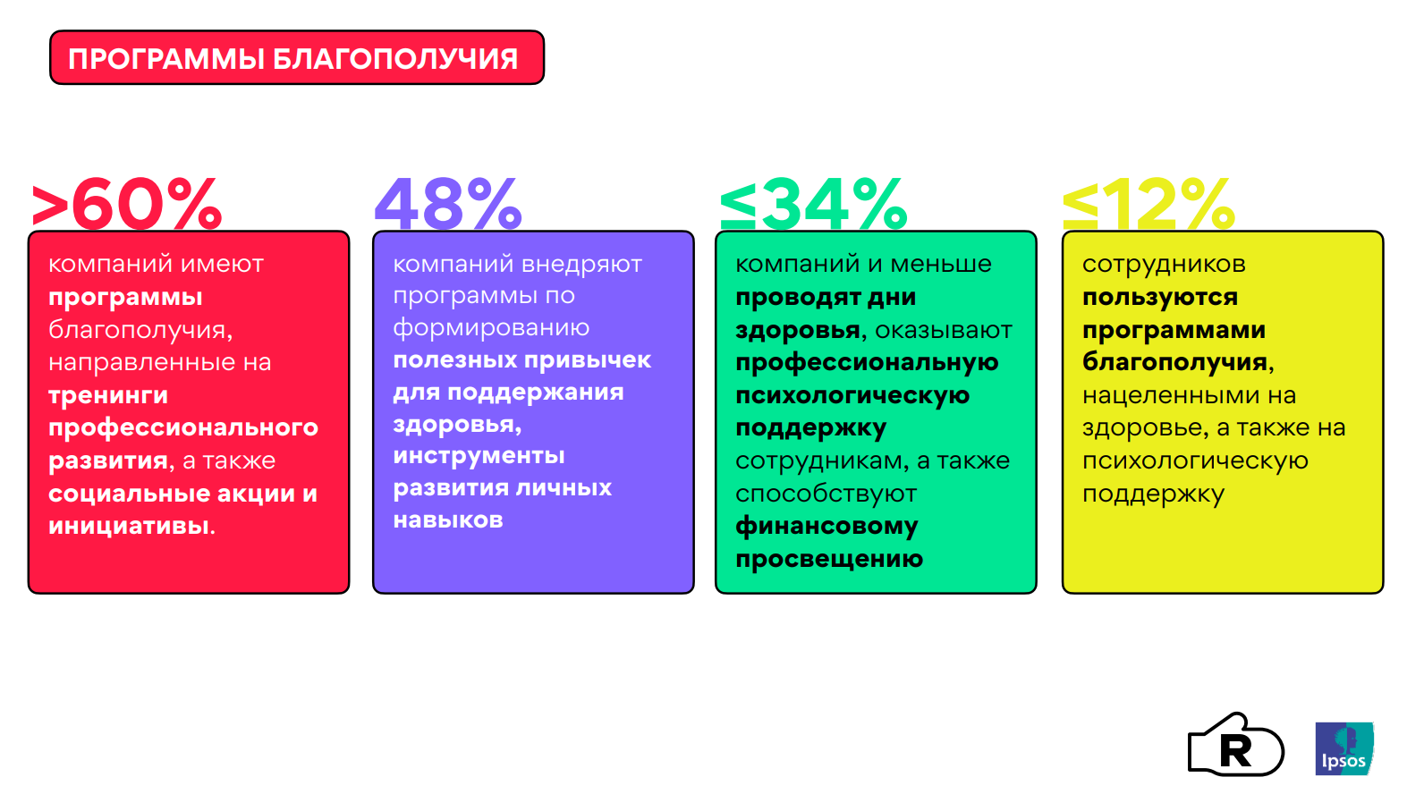 Многие работодатели уже стали задумываться над решением существующихпроблем. Около половины респондентов сообщили, что в их компаниях действуютпрограммы благополучия, нацеленные на поддержку здоровья и внедрение здоровыхпривычек, но посещают такие программы только 12% сотрудников. Причина —банальное отсутствие времени. В условиях высокой загрузки люди скорее отдаютприоритет изучению профессиональных навыков, чем заботе о собственномблагополучии.
