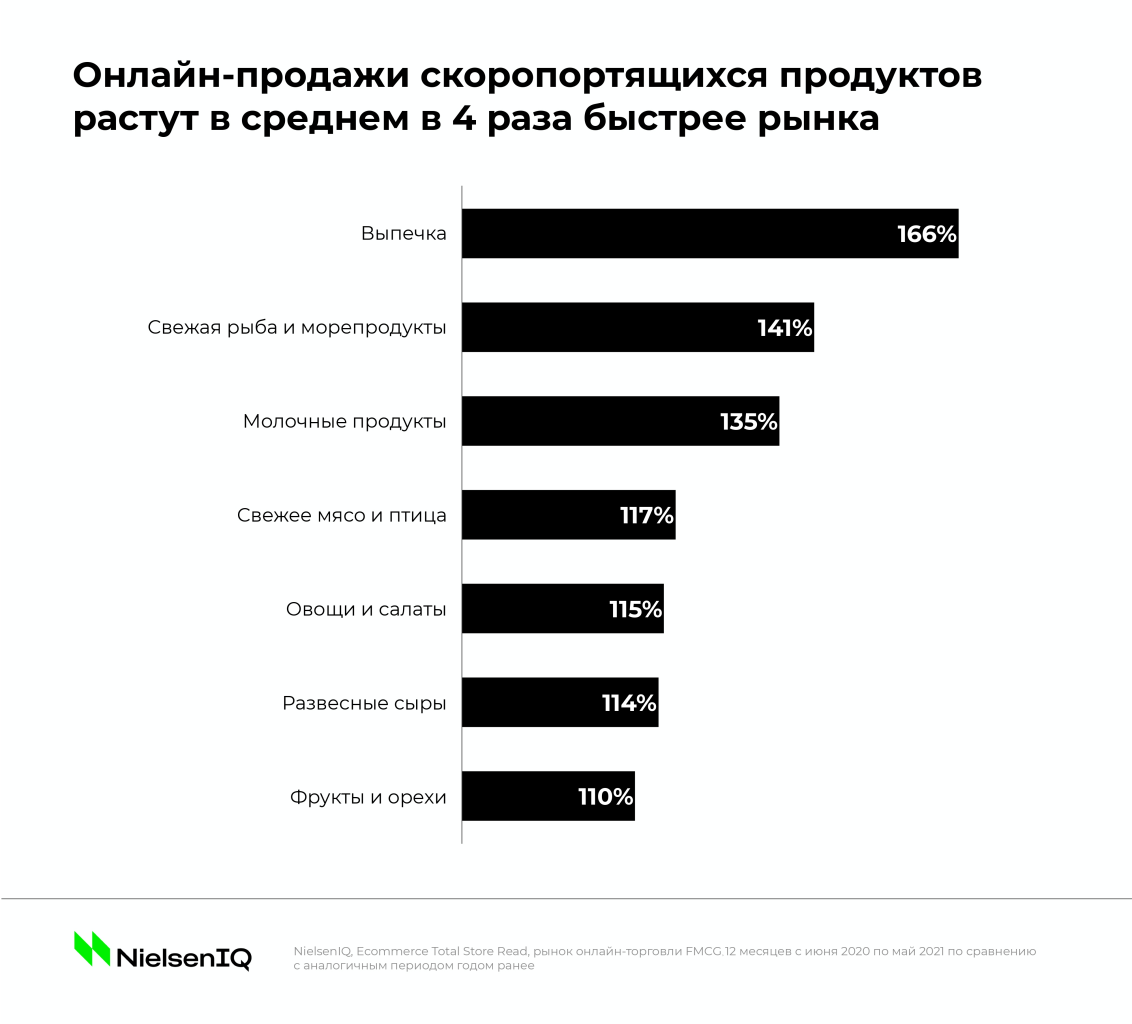 Динамика онлайн-продаж скоропортящихся продуктов остается высокой даже послековидного 2020 г., который заметно изменил рынок e-commerce. По даннымNielsenIQ, в июне 2020 — мае 2021 г. категория «ультрафреш» продемонстрироваларост почти на 120% год к году. В то же время продажи FMCG в интернетеувеличились на 32% в денежном выражении, подсчитала исследовательскаякомпания.