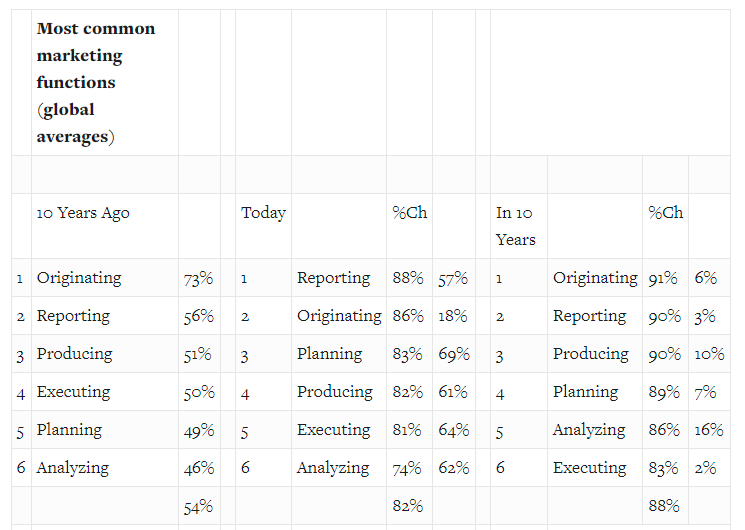 Распространение технологии искусственного интеллекта и повсеместнаяавтоматизация принесли свои плоды. Если раньше разработка кампании находиласьна третьем месте среди самых рутинных задач, то сейчас она находится начетвертом. Аналогичным образом реализация кампании опустилась с четвертого напятую строчку.