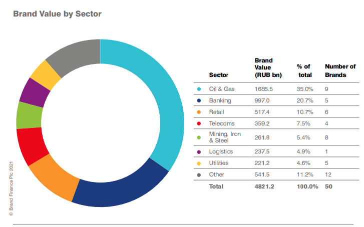 Крупнейшим сектором в России является нефтегазовый. В рейтинге онпредставлен девятью брендами, на которые приходится 35% общей стоимости BrandFinance Russia 50 2021. Второй крупнейший сегмент — банковский (пять брендов,21% от общей стоимости), за ним следует ретейл (шесть брендов, 11% общейстоимости).